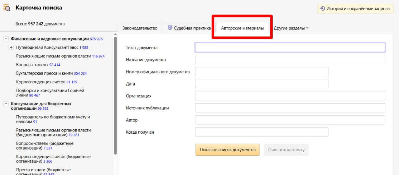 В карточке поиска есть специализированные поля для уточнения поиска: «Организация», «Источник публикации» (поиск в конкретном журнале, газете), «Автор» (публикации конкретного автора). Благодаря новой возможности не надо думать, в каком из разделов искать информацию по своей ситуации, поиск будет единым по всем авторским консультациям в системе.
