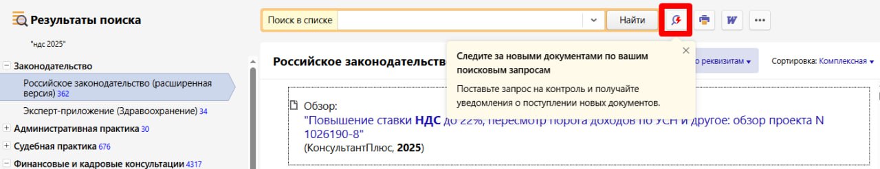 В ноябре 2025 г. в КонсультантПлюс появилась возможность ставить на контроль поисковые запросы. Теперь в системе КонсультантПлюс можно ставить на контроль не только документы, но и свои собственные поисковые запросы. При постановке запроса на контроль можно выбрать разделы или даже конкретные информационные банки, которые нужно отслеживать. Когда по поставленному на контроль запросу появятся новые документы, в системе появится оповещение.