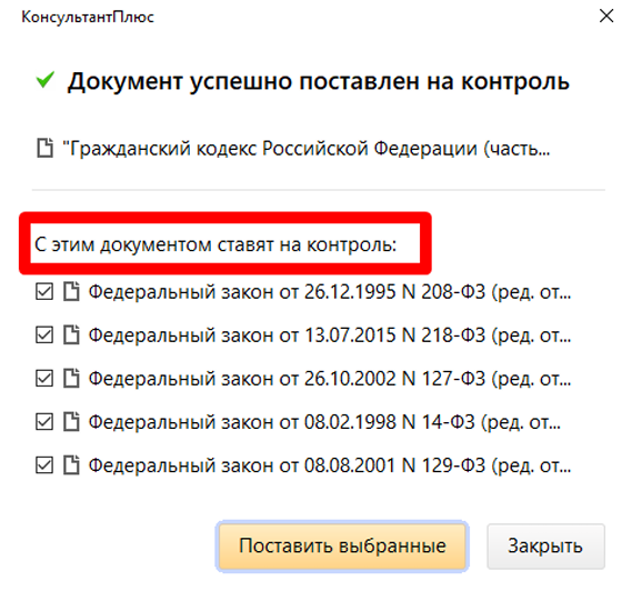 2. Улучшения в «Документах на контроле». Еще одно нововведение - при постановке на контроль документа можно дополнительно поставить на контроль и документы, связанные с ним. Их список появится при постановке на контроль основного документа. В списке вязанные документы помечены галочками. Можно выбрать все предлагаемые документы или оставить только нужные. Функция позволяет оперативно узнавать об изменениях в важных для пользователя документах.