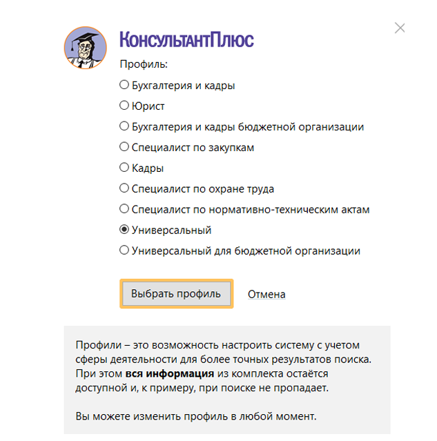 3. Подбор профиля. Пользователи могут настраивать систему КонсультантПлюс под свои профессиональные интересы, выбрав один из 9 профилей («Бухгалтерия и кадры», «Юрист»,