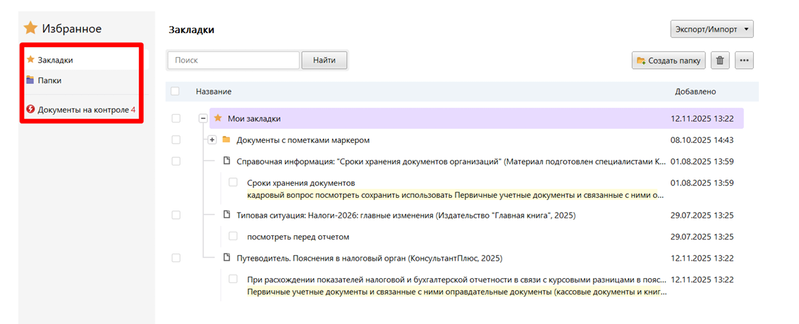1. Редизайн «Избранного». Обновился дизайн и функционал «Избранного». В нем находятся документы на контроле, сохраненные документы, закладки, документы с пометками маркером. Все вкладки теперь размещены на новой левой панели: «Закладки», «Папки», «Документы на контроле» и «Запросы на контроле». Рядом с «Документами на контроле» и с «Запросами на контроле» будет появляться число документов или запросов с непросмотренными изменениями. Теперь можно проводить поиск: - во вкладках «Закладки» и «Папки». Найденные фрагменты будут подсвечиваться; - во вкладках «Документы на контроле», «Запросы на контроле». Отображаться будут документы, подходящие под поисковый запрос.